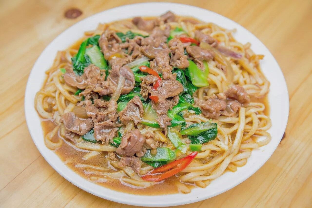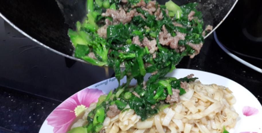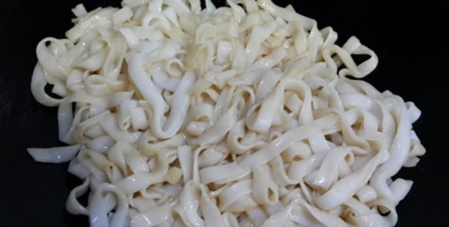 开大火,下粿条,翻炒几下,下酱油水,使酱油水和粿条充分融合,翻炒至粿条变金黄色,装盘待用。