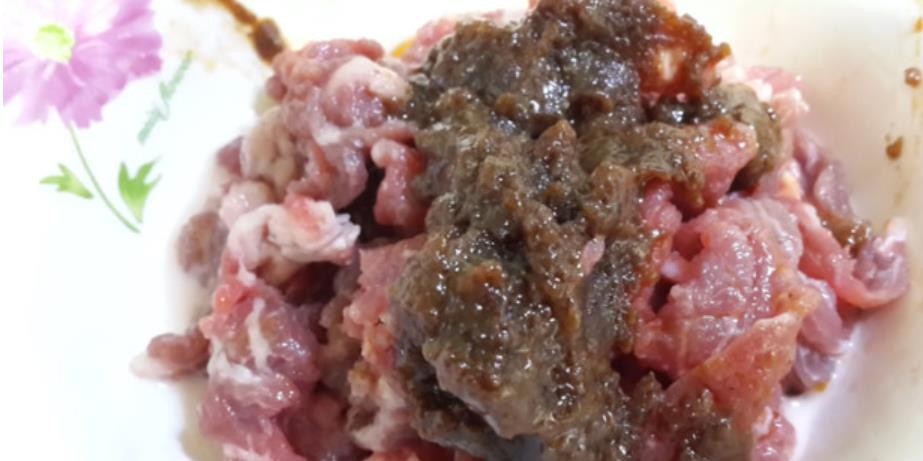 牛肉加入沙茶酱,1小勺生粉,1小勺油,充分搅拌均匀,腌制5分钟。
