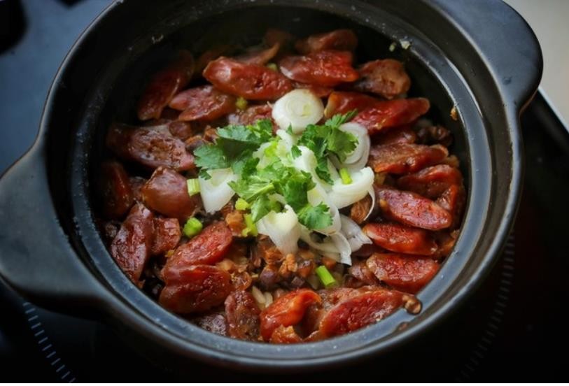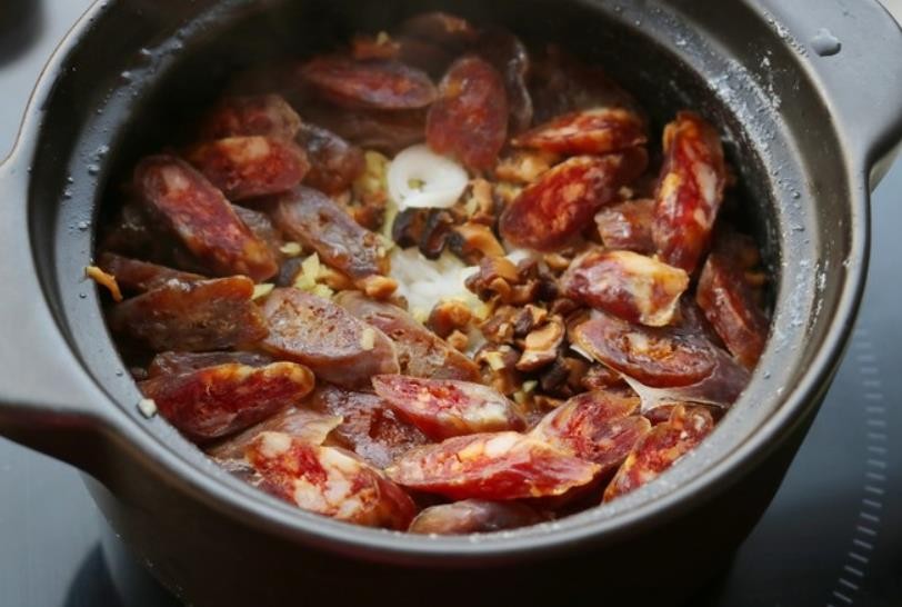 先把香菇末,葱姜末洒在米饭上。再摆上切成片的腊肠,摆满表面,盖上盖子再焖5~8分钟。