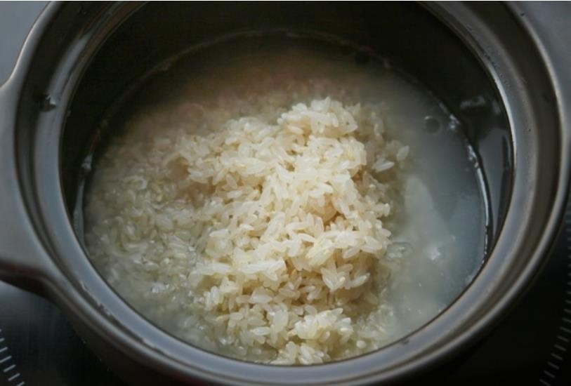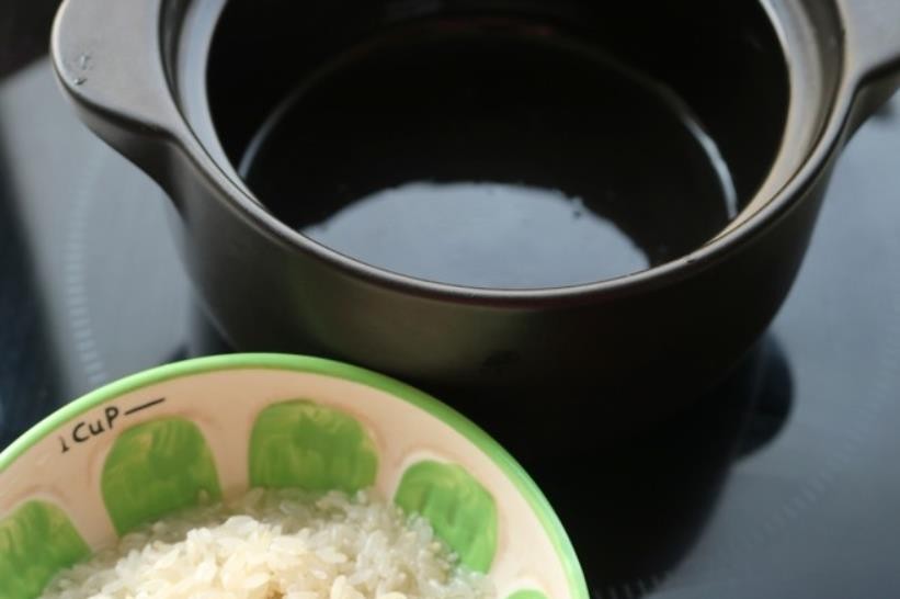 米洗净后放入砂锅,加入210克水。将砂锅放在电陶炉上煮,水开后转小火煮。