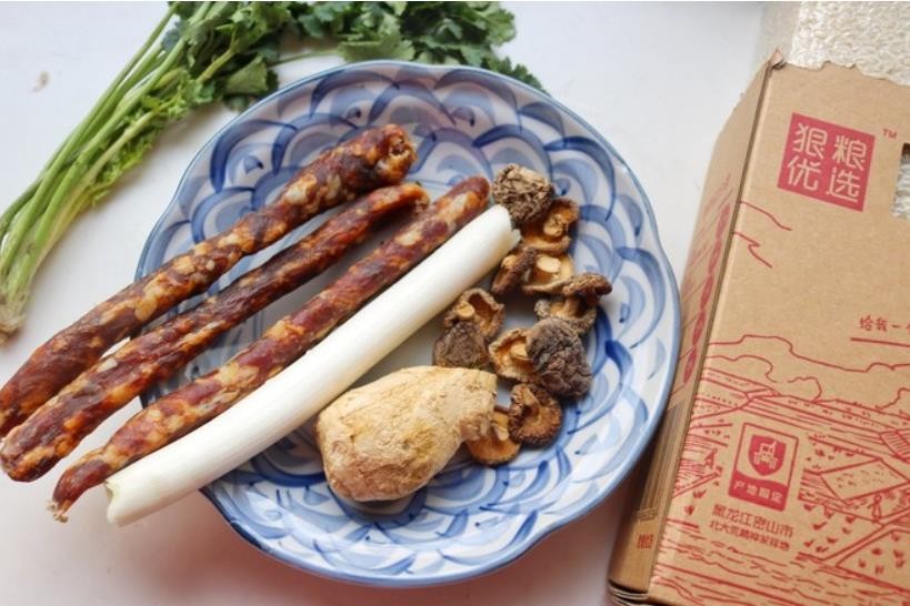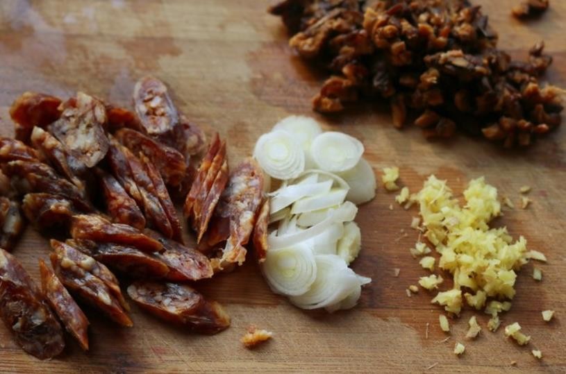 将腊肠切成片,葱姜切末,香菇提前泡发也切末。