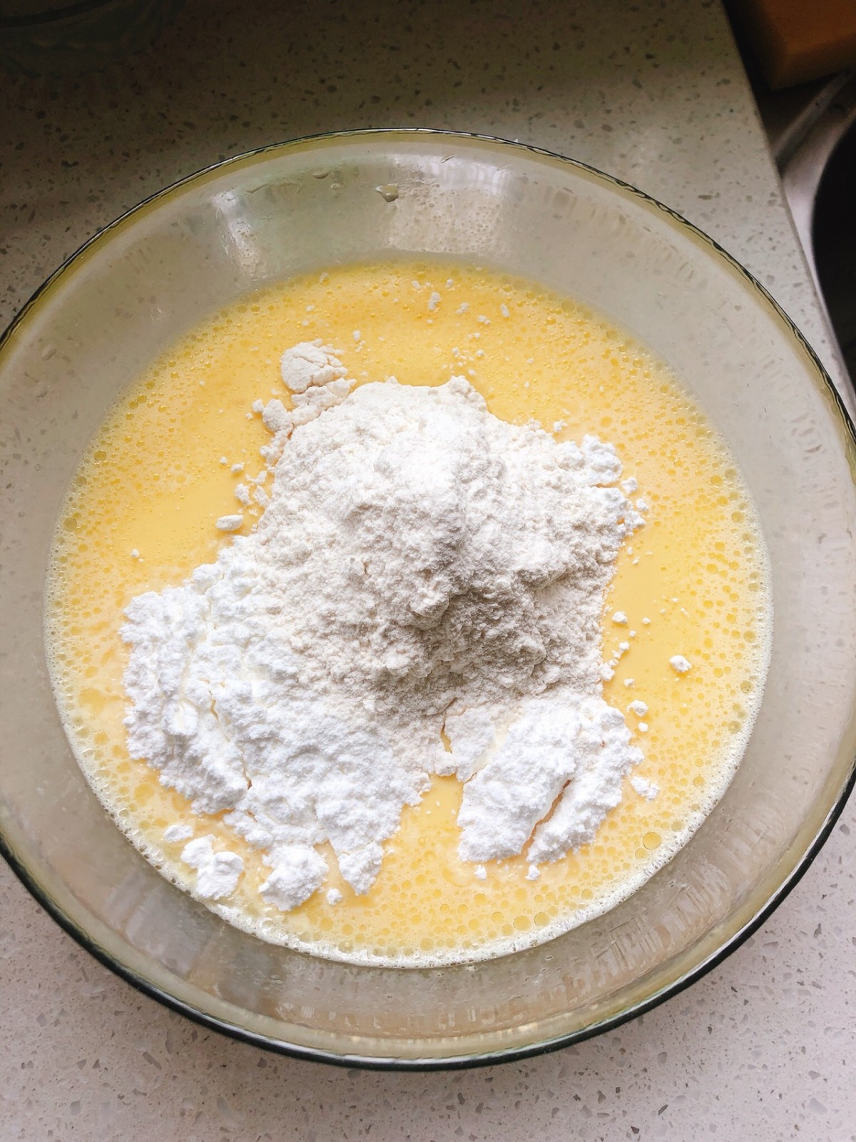 鸡蛋加入盐 、糖、清水搅匀,之后加入牛奶 、淡奶油搅拌,再加入黄油或植物油,最后加入面粉搅拌均匀。