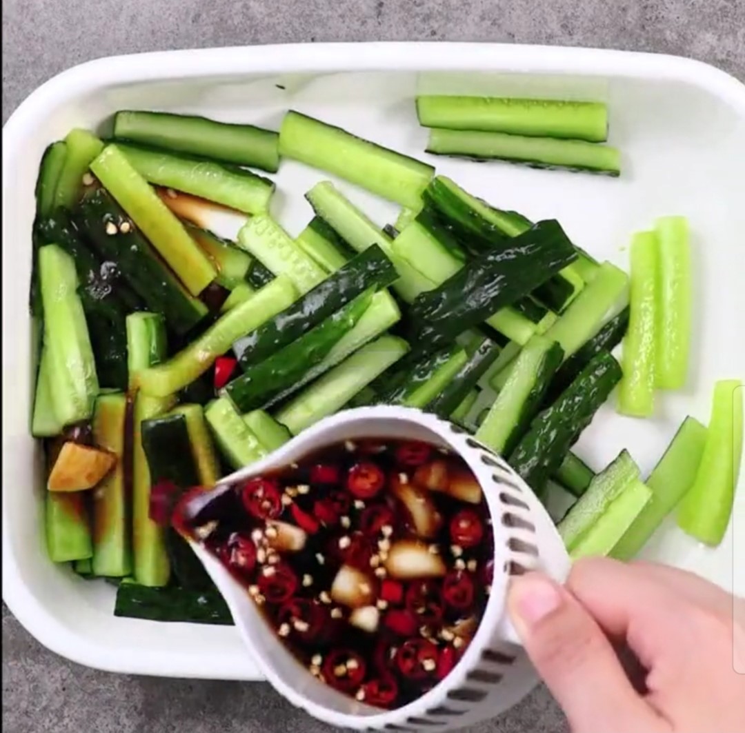 黄瓜取出,倒去多余水分,浇汁搅拌,再次放入冰箱,腌制5小时