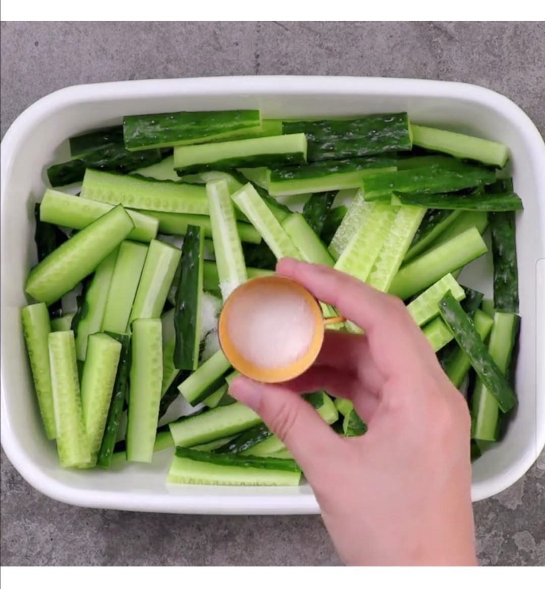 黄瓜切长条,加盐,糖,搅拌,放冰箱腌制一个小时