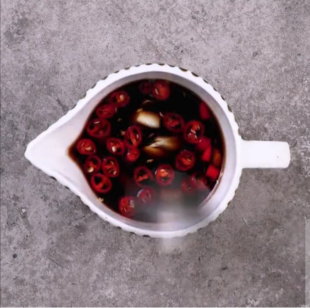大蒜切片,辣椒切片,加调味料,生抽,糖,醋,盐,酱拌均匀
