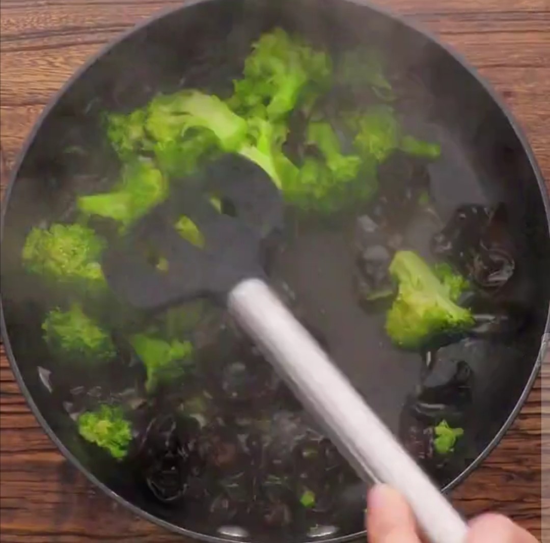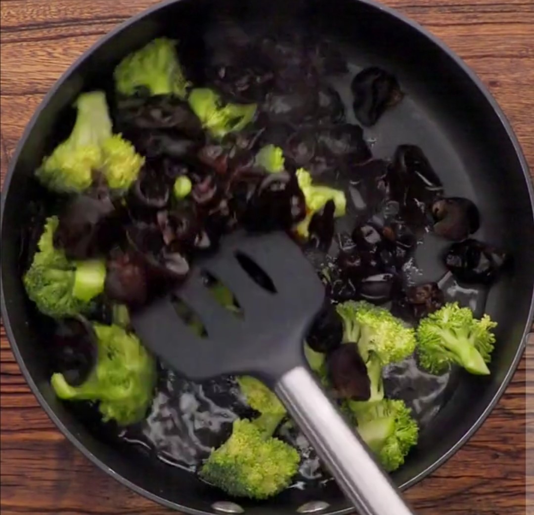 西兰花,木耳,蚝油,盐,水,倒入油中炒