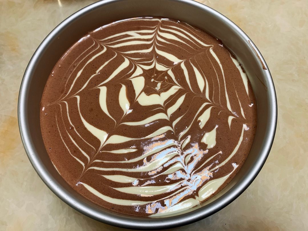 一勺原味蛋糕糊一勺可可味蛋糕糊,轮流加入,用牙签划出花纹。