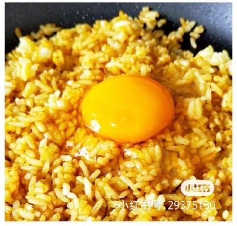 把咖喱块放入有油的锅中,半融化状态就可以放米饭,待米饭裹上咖喱后打入鸡蛋炒匀。