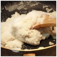 把搅拌好的豆沙倒入平底锅内,小火慢炒,感觉水份蒸发,有点干的时候,加少量的油,继续炒,共加油三次即可。最后炒到感觉阻力越来越大,放入适量的糖,再炒片刻即可,做好的芸豆沙备用。
