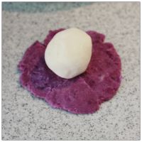 取1份紫薯泥,揉圆,压扁,再取1份芸豆沙,揉圆,放在紫薯里。