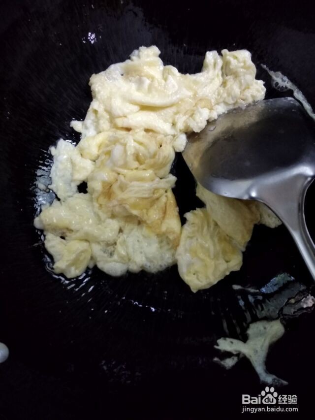 将蛋饼翻拌,翻成小块,准备铲出备用