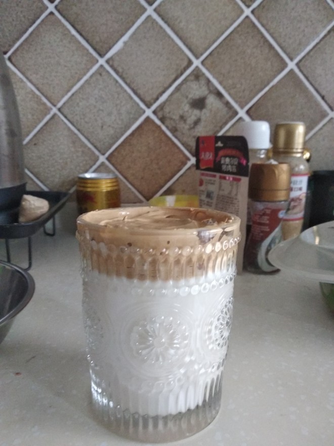 杯子里倒好牛奶,再把打发好的咖啡拿勺子加到上面,之前打发有点硬成团的话拿勺子轻轻抹平就行