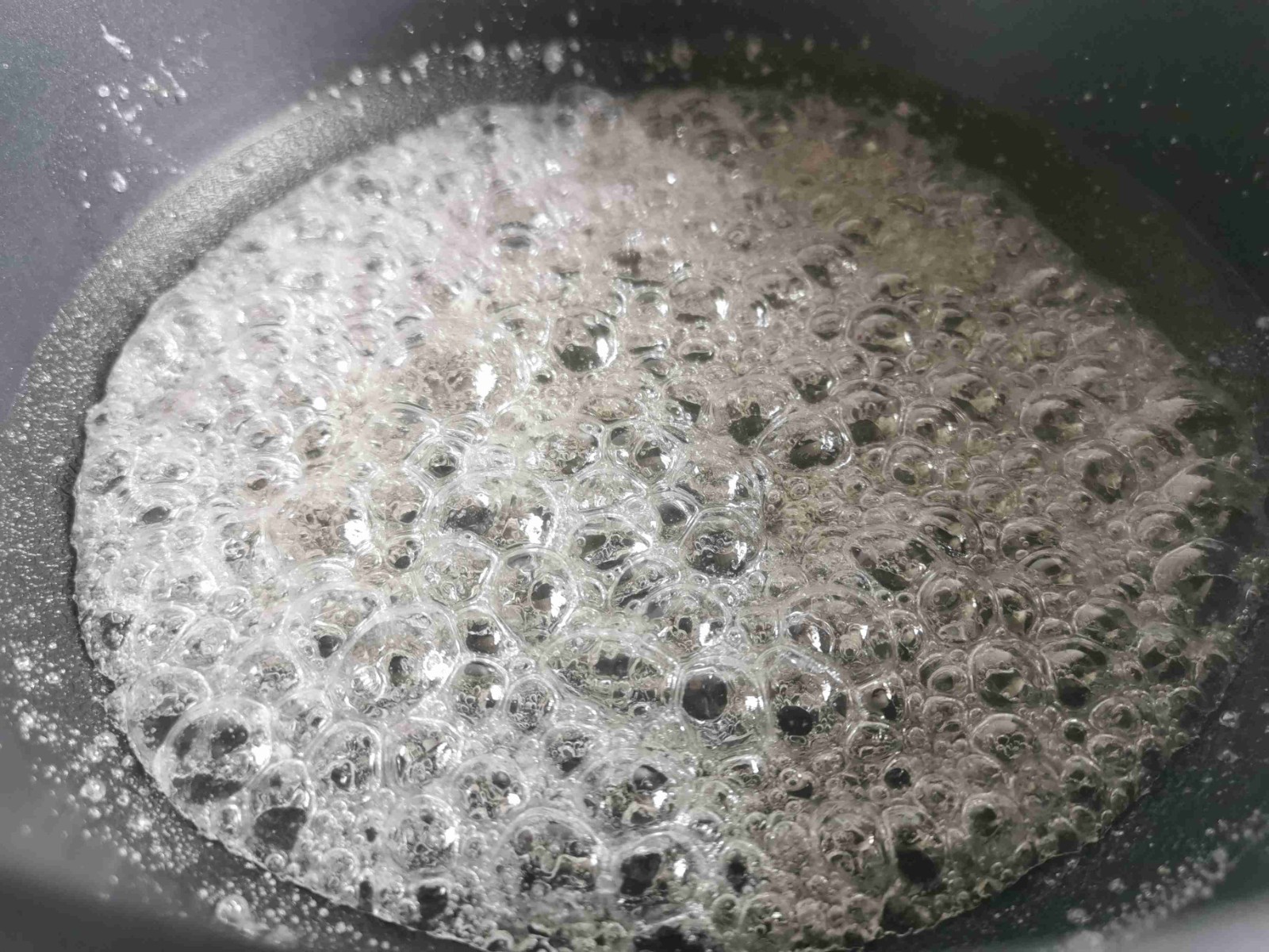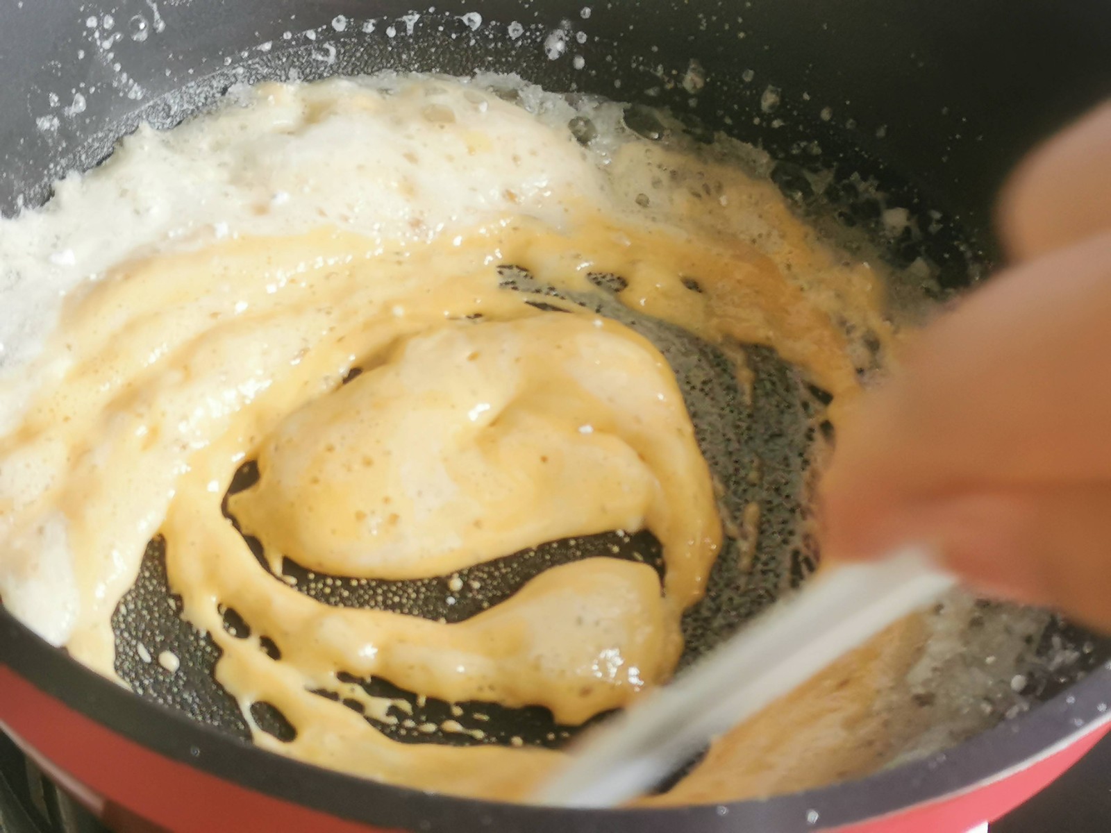 细砂糖、水倒入不粘锅中,小火加热,一直到有点焦黄色,关火