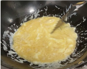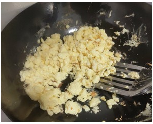 蛋液快凝固时迅速搅动,待鸡蛋完全成型后捞出备用。