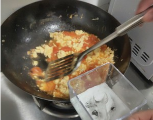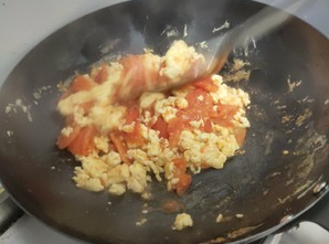锅内留少量油,烧热后下入西红柿,翻炒出汁后加入鸡蛋继续翻炒。此时如果锅内水分不够可以加少量清水。
