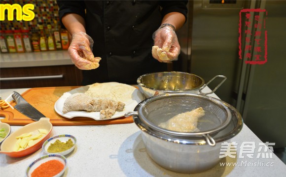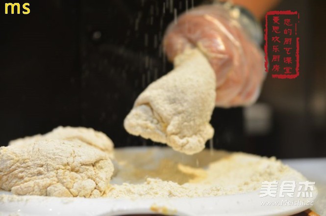 泡好的鸡腿拎出控干水,再均匀地裹一层粉