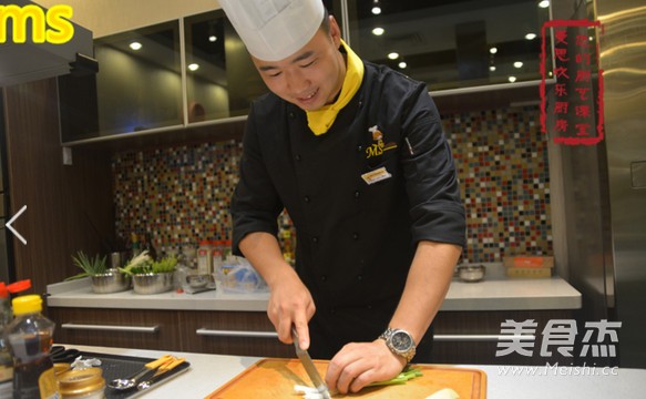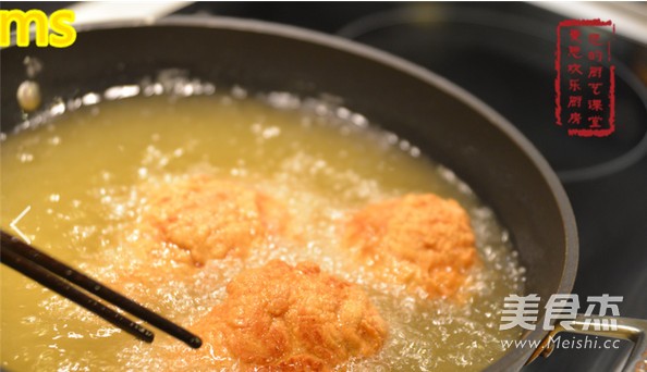 大火烧油至七成热,老师说七成热就是略有轻烟浮起。 炸鸡腿! 先大火,等鸡腿大致定型,外皮不脱,略硬的时候转中小火。 一定要炸到鸡腿表面金黄酥脆,里面全部都熟透。 (也可以拿竹签来试验,扎到鸡腿中部拔出,如果竹签的头部很烫说明里面已经炸透了。)