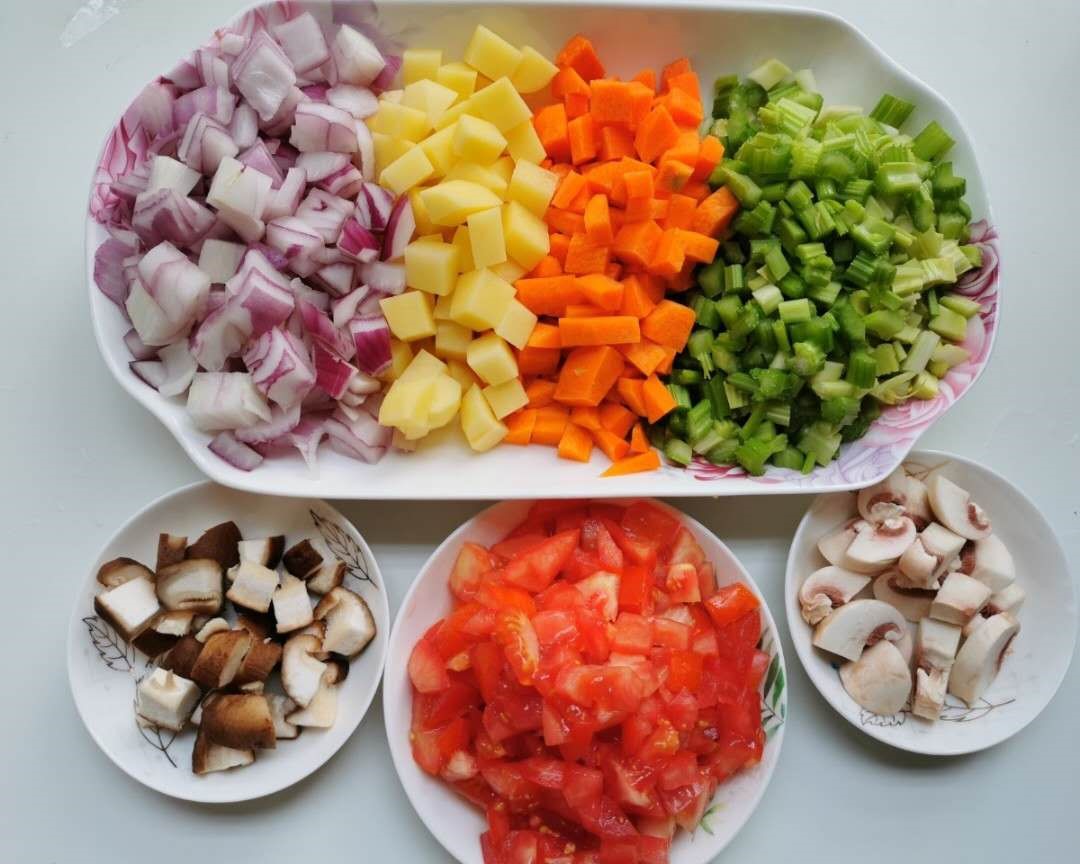 洋葱,洋芋,胡萝卜,青葱,番茄,蘑菇切成小丁块备用。