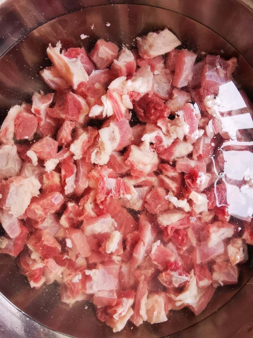牛腩切成小丁块,冷水下锅,煮沸2-3分钟后关火捞出。