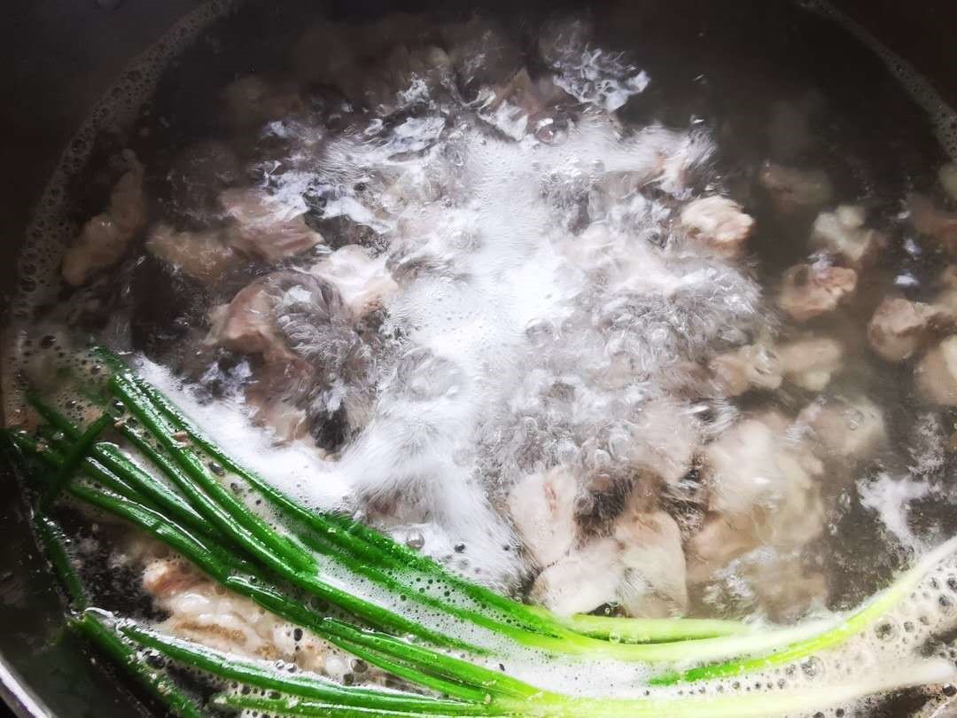 加入小葱,几片姜,适量水,大火烧沸去浮沫,转小火炖1-2小时。
