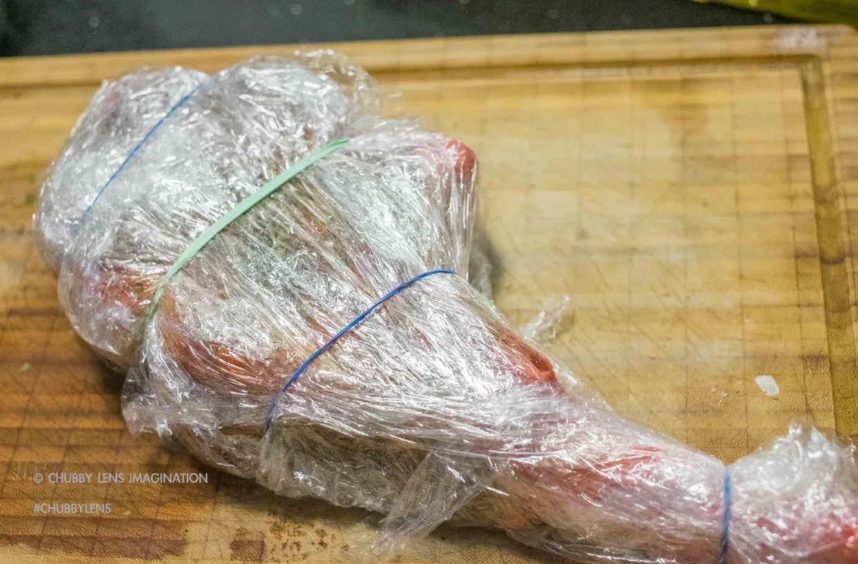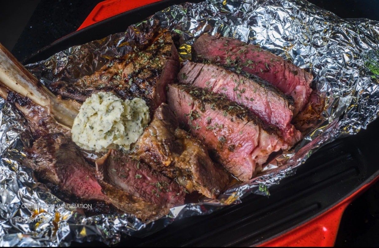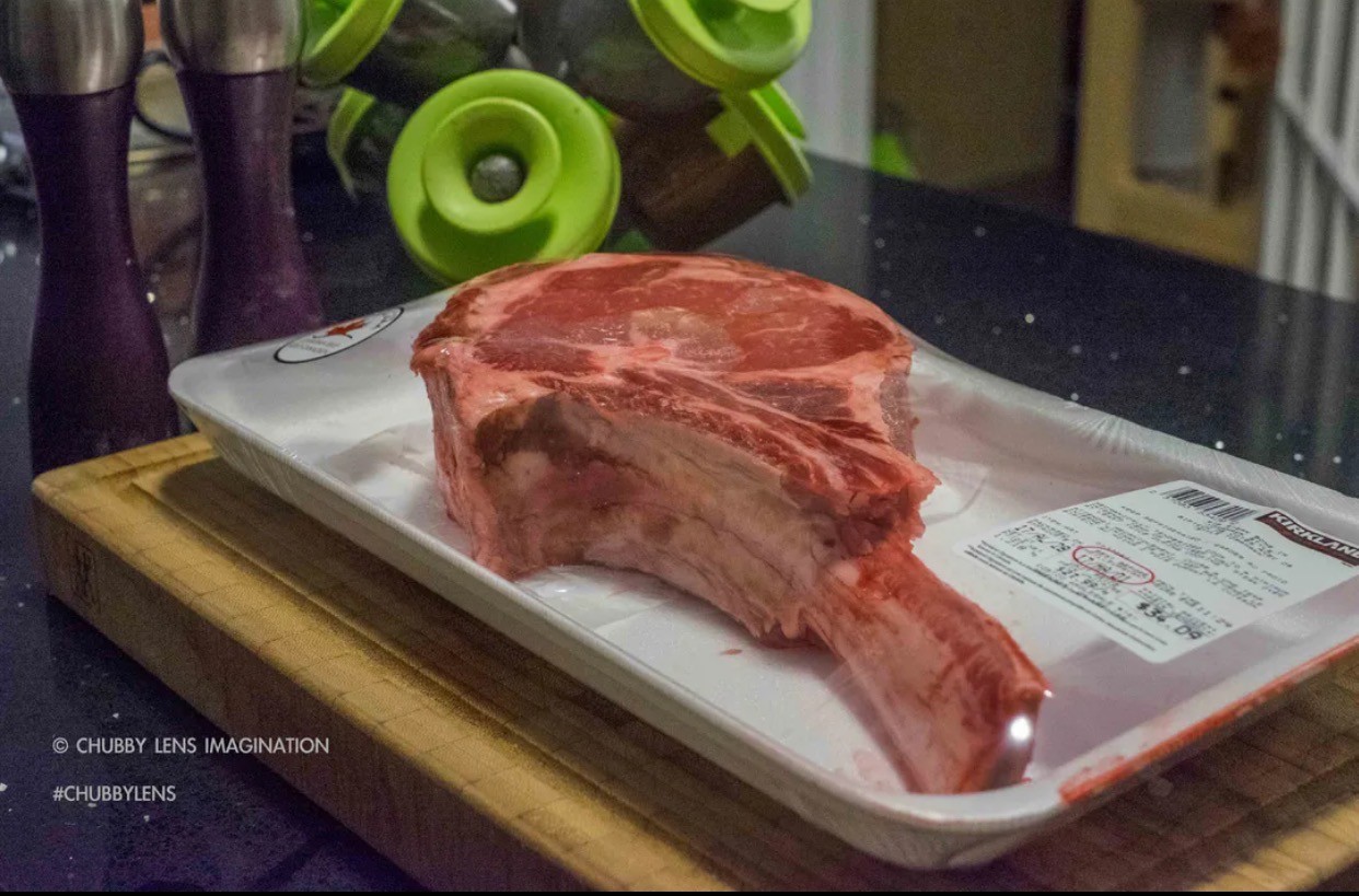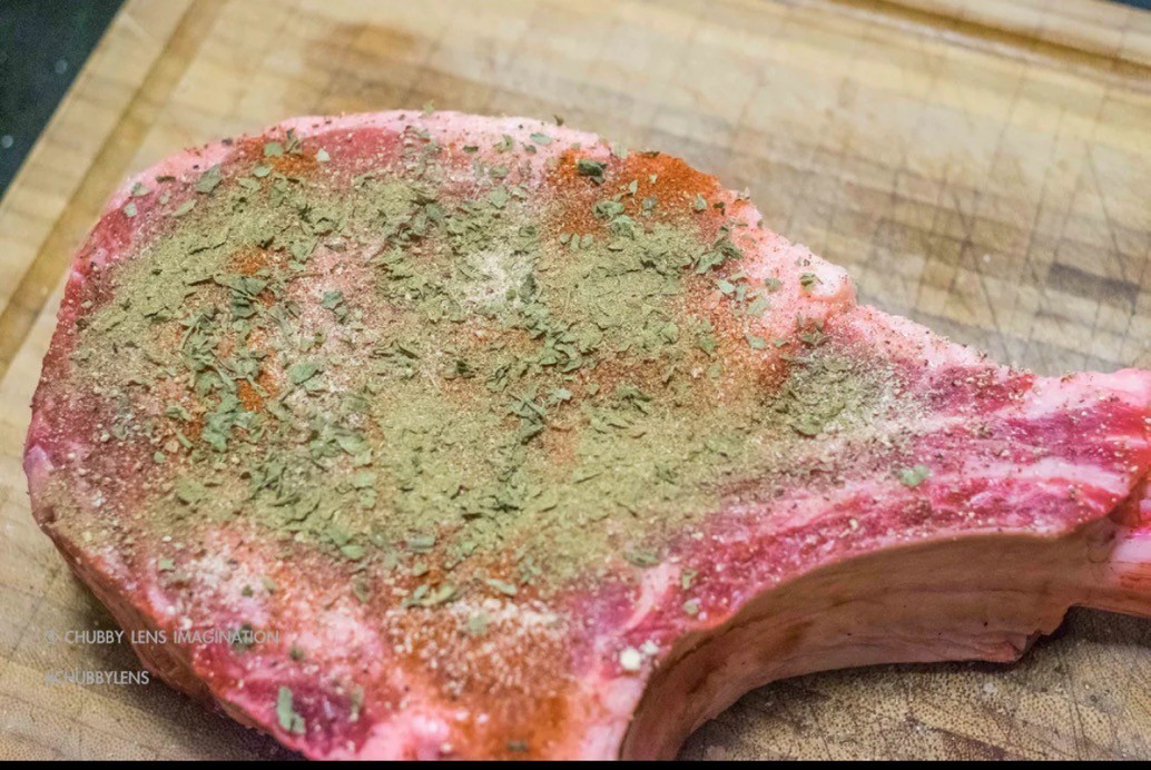 在牛排的一面撒盐、胡椒、百里香、胡椒粉