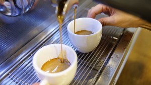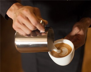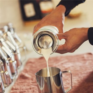 萃取时,同时进行牛奶打发,将300ml的牛奶倒入奶缸。