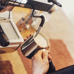 将蒸汽棒插入牛奶中,打发切割,牛奶加热后,泡沫达到奶缸的8分满。