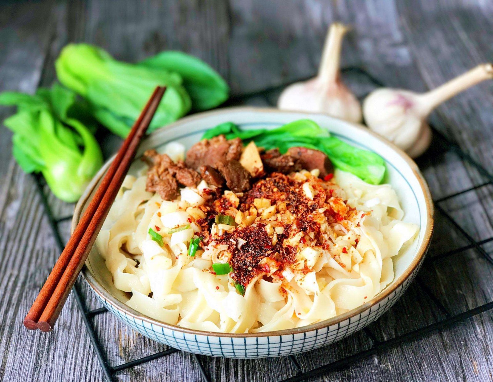 面和青菜可以一锅煮,不过青菜要在面快好的时候下锅,煮好后盛在调好碗汁儿的面碗里,将葱姜蒜末堆头,再加上干辣椒面,最好用山西辣椒面,香且辣度也够 坐锅烧热油,至冒烟,用勺子浇在码好东西的辣椒上,会有滋啦的响声