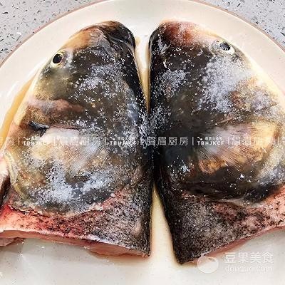 2.将料酒、胡椒粉、盐撒在鱼头上,抹匀,腌制约20分钟。