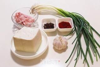 准备食材。卤水豆腐一块、猪肉馅适量。辣椒面10克、花椒10克、蒜10克、香葱适量、郫县豆瓣酱适量、食用油适量、酱油少许、水淀粉30克、鸡精1克、香油几滴。