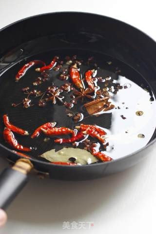 锅中油小火,入花椒5g、干辣椒10粒、八角2颗、桂皮一段、香叶2片,煸出香味后丢掉