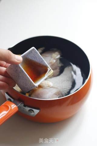 洗净鸡腿入锅,料酒适量,凉水淹过,大火烧开,出净血沫
