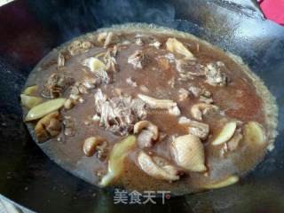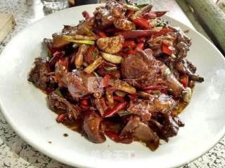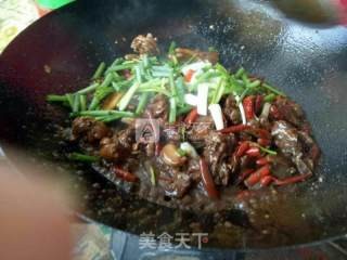 下干红椒,红烧酱油,啤酒,炒上色,再加汤大火烧开。焖5-10分钟,中小火入味,收浓汤汁调味。