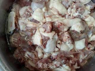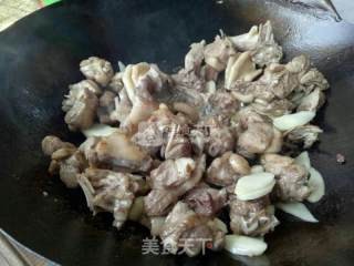 取锅下油,下少许盐,姜蒜,下入鸭子炒香至脱骨。