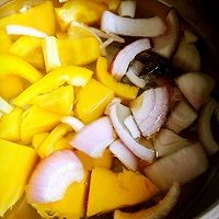 将芒果,洋葱,黄柿椒切块儿,放八角一粒,白醋1咖啡勺,加适量水煮,煮的时间大约在30分钟左右。