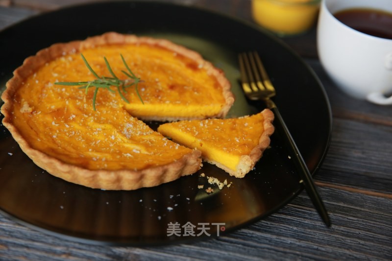 蒸熟的南瓜与馅料部分其他材料一起倒入料理机中充分打匀。派皮出炉后,将南瓜派馅用网筛过滤后倒入派盘中。