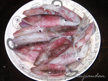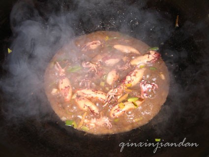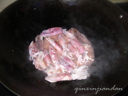 起油锅,爆香姜蒜,下鱿鱼煸炒。