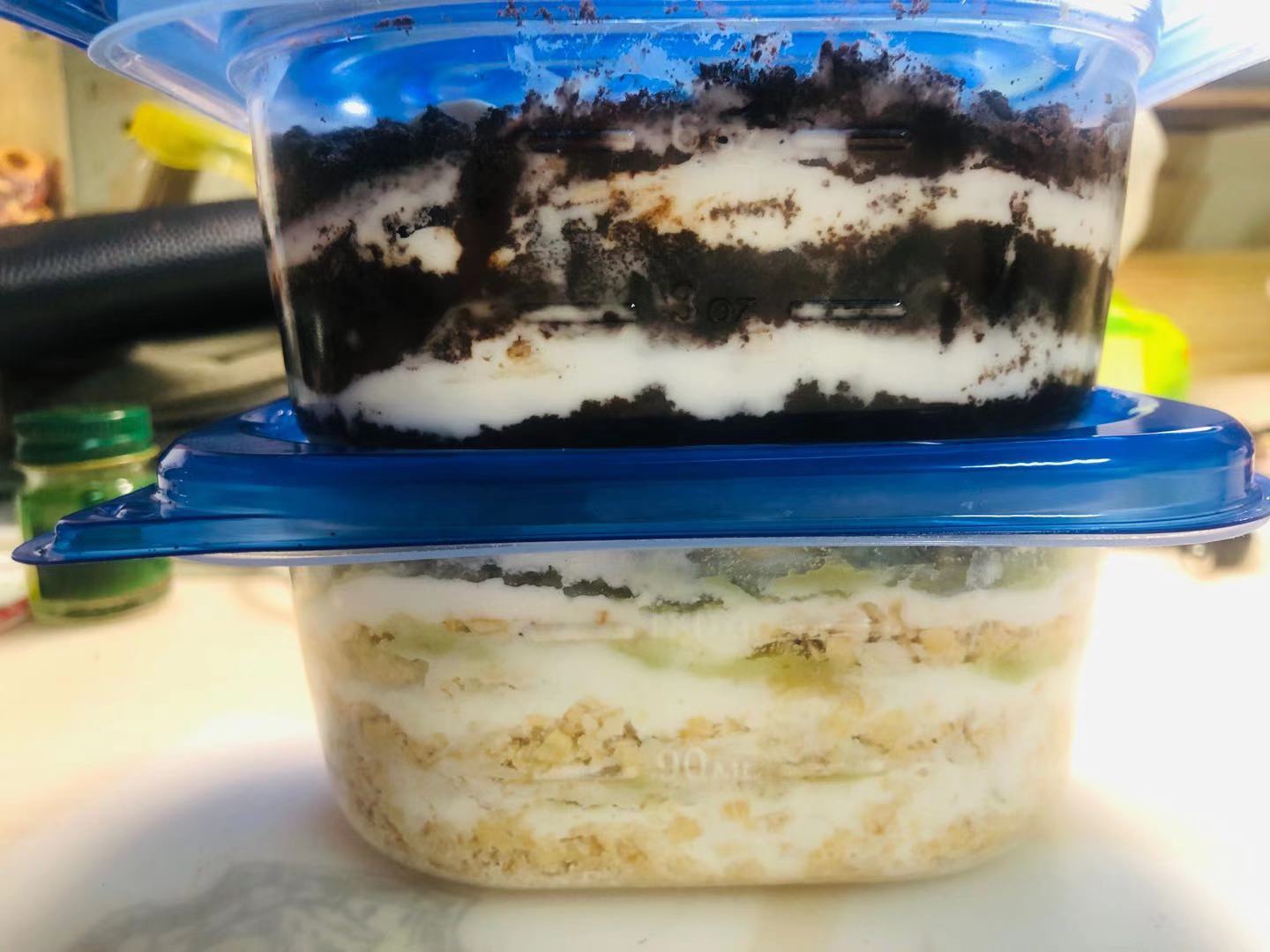 在盒子中将麦片、酸奶、香蕉、豆浆粉依次铺好