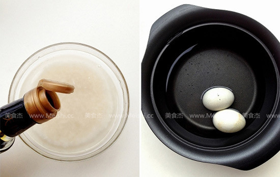 将大米淘洗干净,放入水,倒入香油搅匀后浸泡30分钟,起锅加水,烧开后放入皮蛋煮5分钟