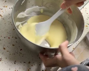 先用刮刀取三分之一蛋白霜加入蛋黄糊,翻拌均匀,再把蛋黄糊倒回装蛋白的盆内,翻拌至上图状态