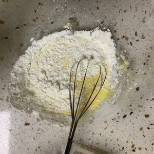 蛋黄加牛奶,用蛋抽搅拌均匀 筛入32克低筋面粉,划一字型搅拌至顺滑无颗粒状