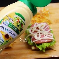 切好的意面块,放上生菜、煎好的火腿、再配上蛋黄酱,放入最后放一块意面即可。