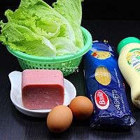 准备食材:意面、火腿、鸡蛋、生菜、蛋黄酱等食材;
