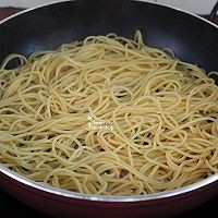 锅中少许油,放入拌过橄榄油的意面,把调均的鸡蛋淋在意面上面