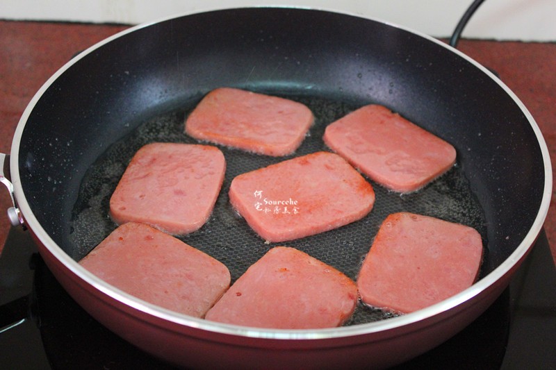 火腿切片;热锅,倒油,小火煎香火腿,起锅;
