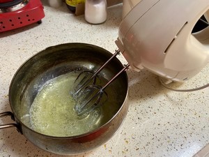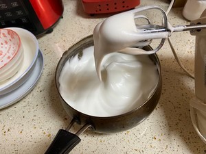 蛋清加10g糖打至湿性发泡,如图中所示的大弯钩,且蛋白霜不流动。这一步建议使用电动打蛋器中高速打发,手动打蛋器会比较费力。