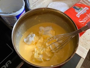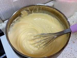 这是混合后的蛋黄芝士酱。加入3勺朗姆酒,搅拌均匀。