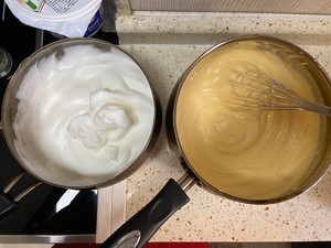 这是操作完成的蛋白霜和蛋黄芝士液。混合两者。分三次把蛋白霜加至蛋黄芝士液中,并用手动打蛋器缓慢搅拌、融入,直至均匀状态。