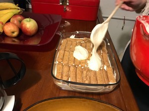这就开始装盘啦。我会铺两层饼干两层芝士液,这样的提拉米苏层次和口感都会好一些。首先,手指饼干两面浸湿(轻蘸即可)咖啡后放入玻璃盘中;然后,铺入上一步骤中一半份量的芝士液;再铺一层蘸好咖啡的手指饼干,最后再把剩余的芝士液铺上即可。(图中是在铺最后一层芝士液了。)