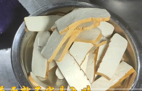 攸县香干切成片,放入滚水中焯一下捞出沥干水分;青、红辣椒洗净切碎备用、蒜苗洗净切段备用。